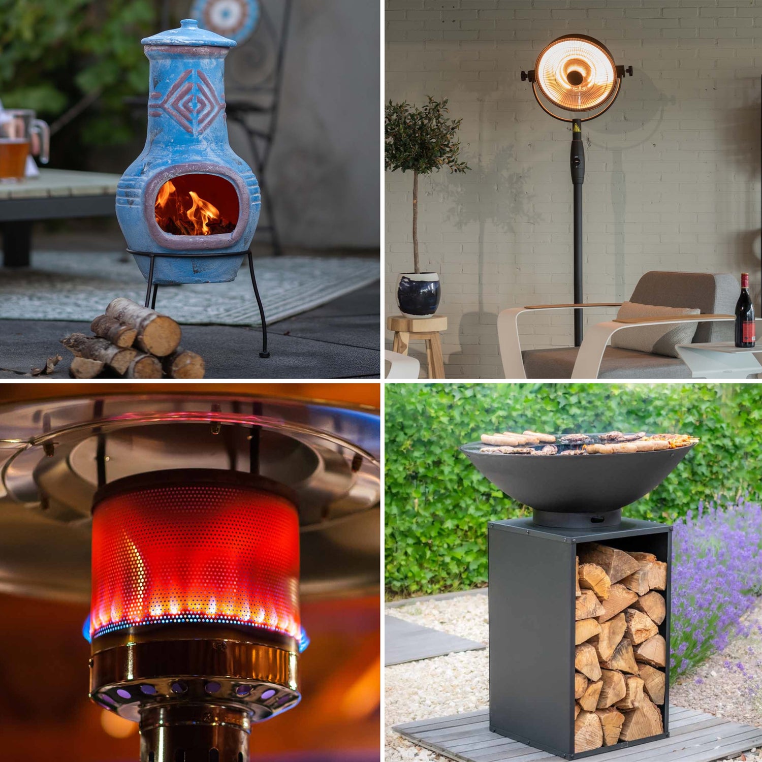 Vælg en terrassevarmer til gas eller el, alt efter hvad der passer bedst til din terrasse, og brug bålfadet til madlavning eller hyggestunder i haven.