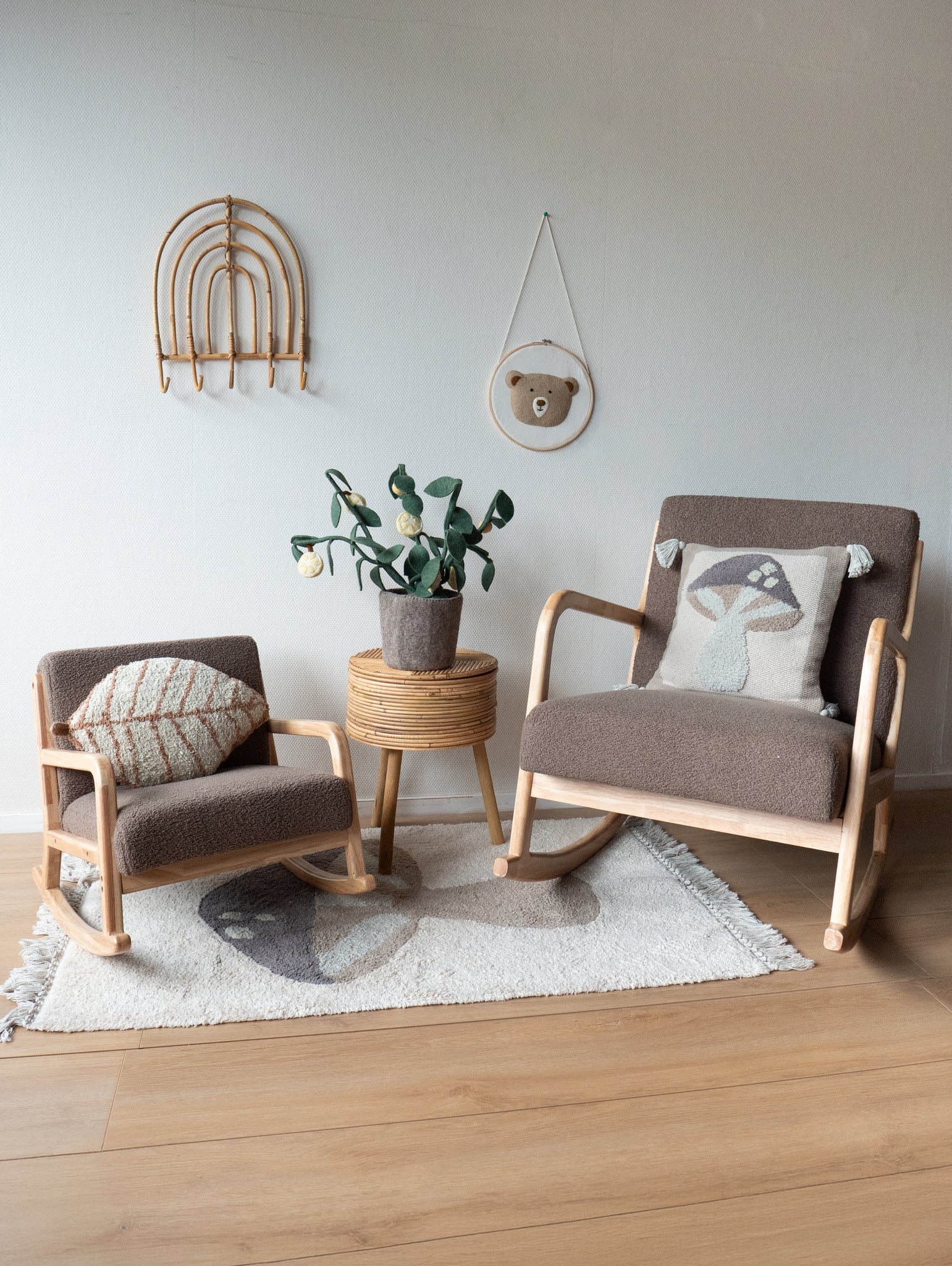 Bare drømme lidt væk eller amme dit barn – det gør du afslappet i Arvin gyngestolen. Stellet er lavet af lakeret træ, og stolen har puder i farven taupe. Sammen med fodskamlen (kan købes separat) er den dejlig at sidde i. Leveres usamlet.