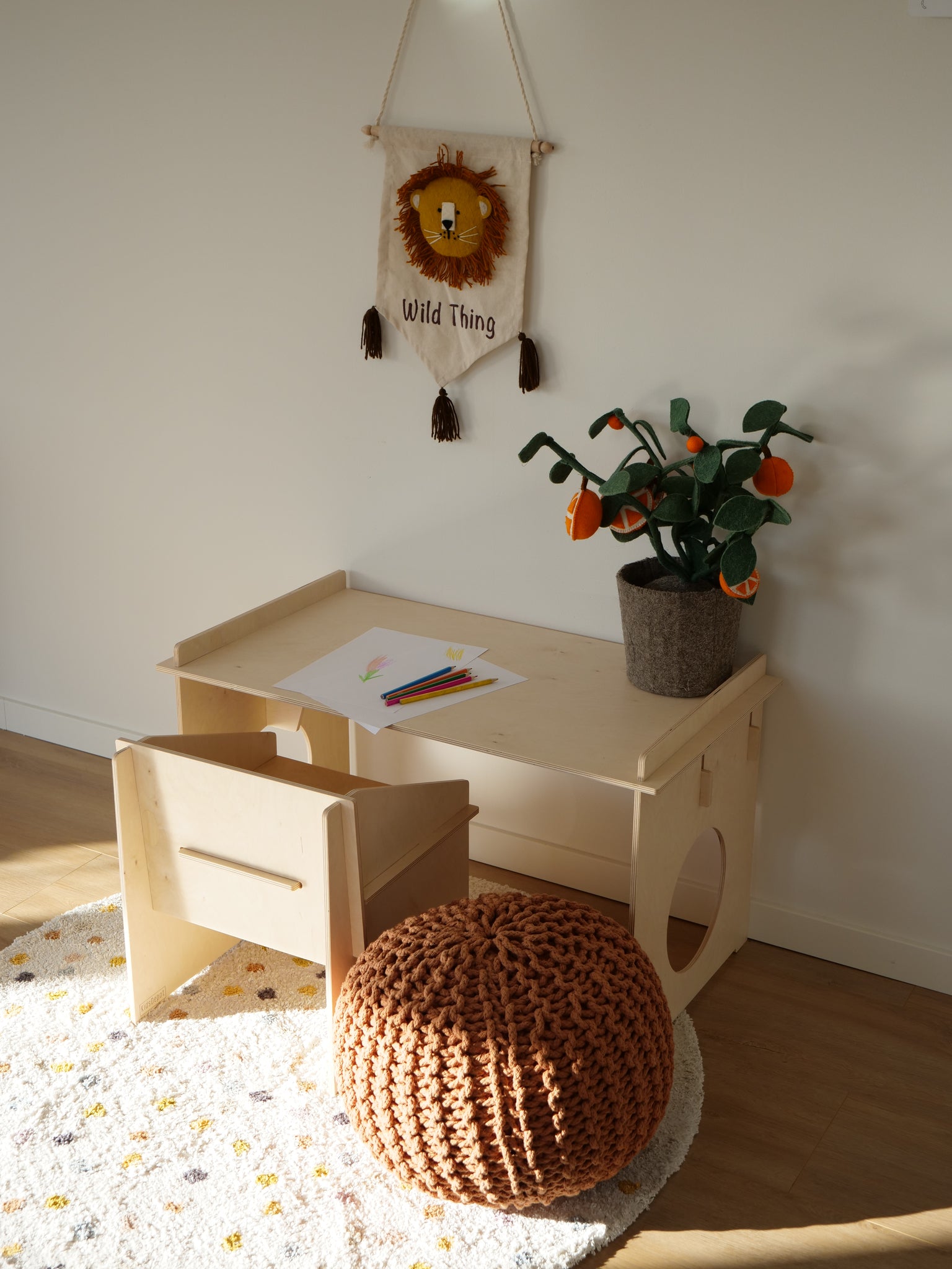 Et fint sæt med et bord og en stol. Bordet måler 85x45 cm og giver dermed masser af plads til leg. Hurtig og enkel montering uden skruer, lavet af FSC-certificeret træ med lakeret finish. Naturfarve.