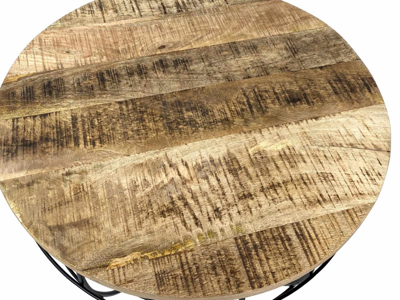 Det runde London sofabord er et elegant og karakterfuldt møbel, der tilfører stuen et råt og stilrent udtryk. Bordet er fremstillet med en massiv bordplade i genanvendt træ kombineret med et dekorativt metalstel i gitterdesign, som giver et let, men markant industrielt look.