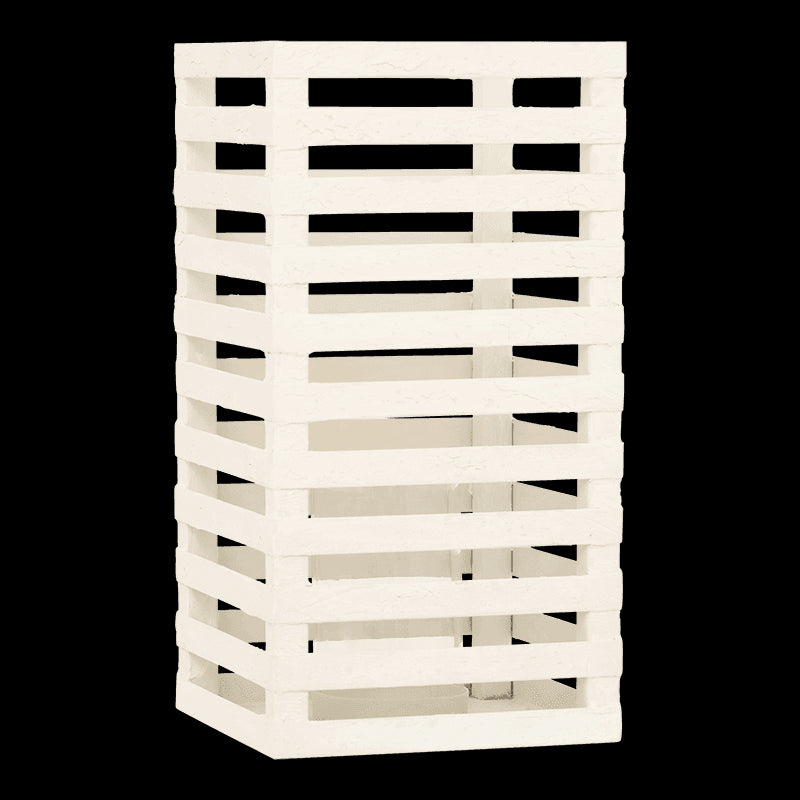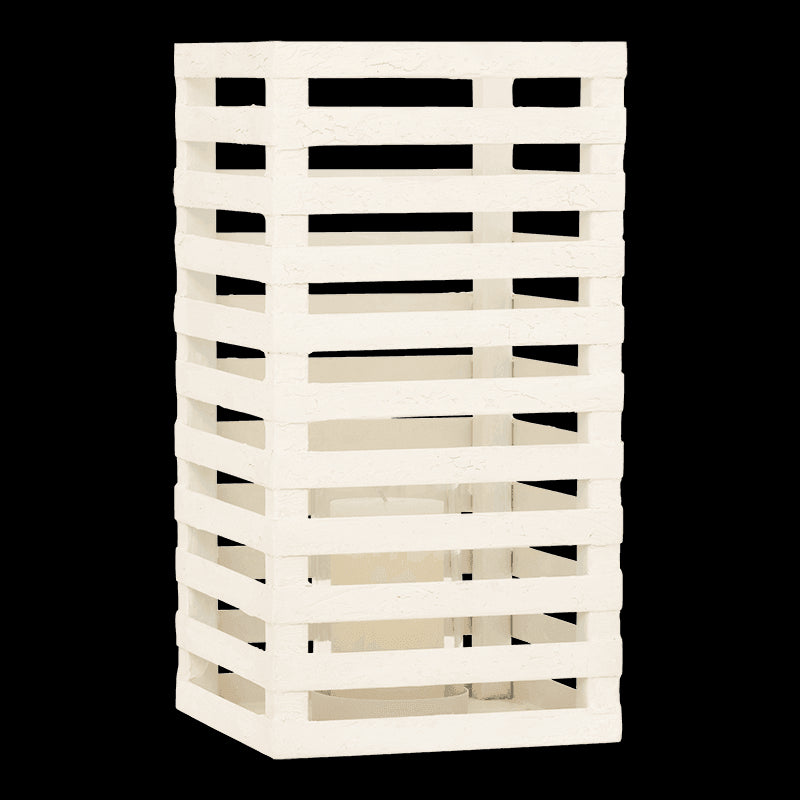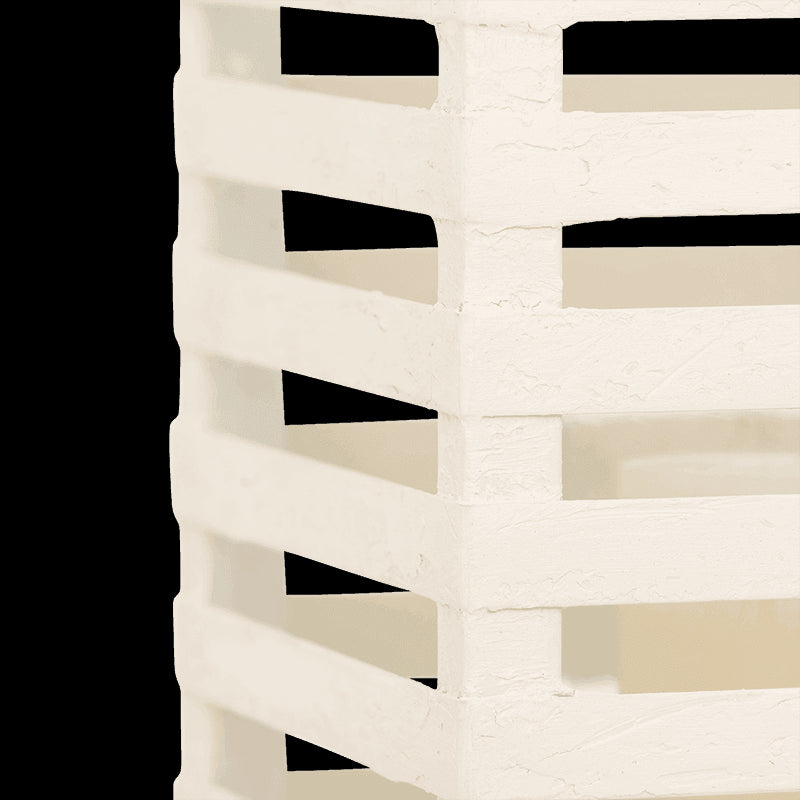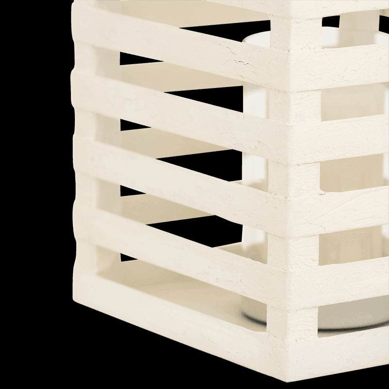 Når dagens varme toner ud i skumringen, spreder Vela-lanternen et blødt og stemningsfuldt lys, der forlænger sommernatten. Den håndlavede lanterne har et geometrisk metalstel med mat, offwhite overflade og et indvendigt glas, som beskytter lyset og fremhæver den rolige glød.